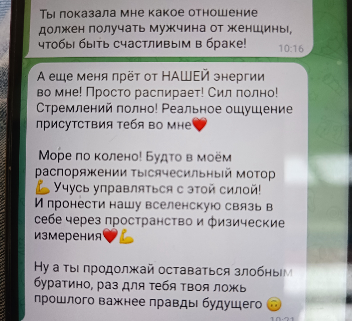 Продолжаю разгребать старые нарциссьи сообщения. Реально страшно от них! Соприкосновение с человеческой тьмой. .... Ровно такое же сообщение я читала в его старом телефоне. Он писал своей первой любви, которую заставил сделать аборт прямо перед их предполагаемой свадьбой. Она думала, что торжество с ним готовит, а он женился на другой и воспользовался её свадебными договоренностями ...... Потом, через 8 лет, прислал ей фото, где он с новорожденной дочкой от жены и под ним написал: "В ней наша энергия". Это капец! Бедная женщина!!!! Представляю, что она испытала в тот момент. ... (ниже я описала - что). Нарцисс в данном сообщение думает, что он меня (и её когда-то) победил... Что он отобрал ресурс - в данном случае все мечты, надежды, все вложенное в него, а на противоположном конце обиженный и сломленный человек, безнадежно влюблённый. Это как победить в войне - радость триумфатора, восторг! Гормонально - норадреналин и дофамин. Это и есть - та самая грандиозность нарцисса