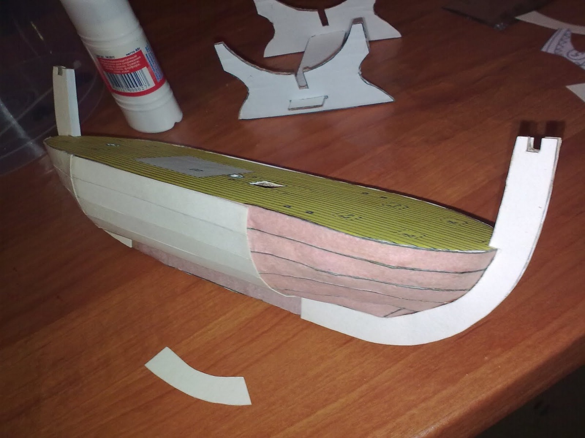 Пара вечеров, индивидуальная подгонка каждого кусочка обшивки (где-то чуть больше отрезать, где-то чуть больше оставить). Вырезал кусочек обшивки из цветной распечатки, прикладывал на место, подрезал лишнее, замечал, где и примерно сколько добавить, накладывал на картон, обводил карандашом, вырезал. Готовый кусочек из картона еще раз подгонялся по месту и только потом приклеивался. Для сборки использовал клей ПВА, а для приклеивания на картон больших шаблонов типа каркаса и палубы - обычный клеящий карандаш. Вот и корпус готов. Лепестки, что торчат над палубой - из обычной бумаги и предназначены для последующего крепежа к ним фальшбортов.