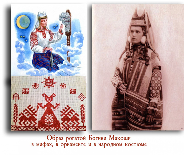 С помощью твёрдых вставок из бересты или дощечек передней части убора придавалась форма рогов, копытца или лопатки. В представлении славян эти символы плодородия богини Макоши могла носить лишь «мужатая баба».
