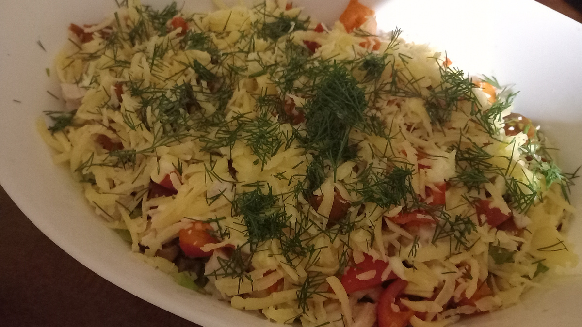Варим куриную грудку и режем ее на кусочки. На растительном масле обжариваем нарезанные кубиками шампиньоны. Помидоры режем кубиками, сыр трем в крупную терку. Листья салата режем на несколько частей. В блюдо для подачи выкладываем сначала листья салата, на них шампиньоны, сеточка из майонеза, далее куриную грудку, сеточка из майонеза, помидоры. Все посыпаем тертым сыром и укропом.