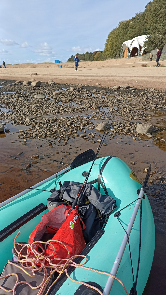 Налаживать якорь в условиях поднявшейся волны мне не хотелось, да и понятно было, что погода уже до заката будет такая, и нормально не половишь. Поэтому оставалось только найти место для выхода на берег. Такое, чтоб не нахватать воды в лодку и на себя. И принципе такое место было найдено. Пока перемещался по ветру вдоль берега, дошел аккурат до границы с Комарово, и там рельеф дна с дальним мелководьем хорошо гасил высокую морскую волну, идущую вдоль берега. Немного понервничал в полосе прибоя, когда попутная высокая волна трансформировалась в шипение "барашков", и... пропадала, идя к берегу уже не страшной мелкой рябью. И в полпятого уже был на берегу.