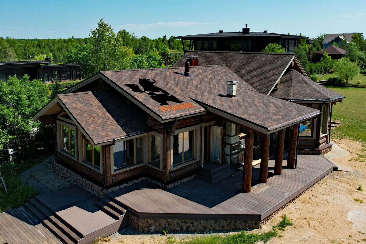 На сруб ушло 280 кубов леса + комплект пиломатериалов для террасы, перекрытий и каркаса крыши (40 кубов). Крыша 404 кв.м. мягкая кровля.