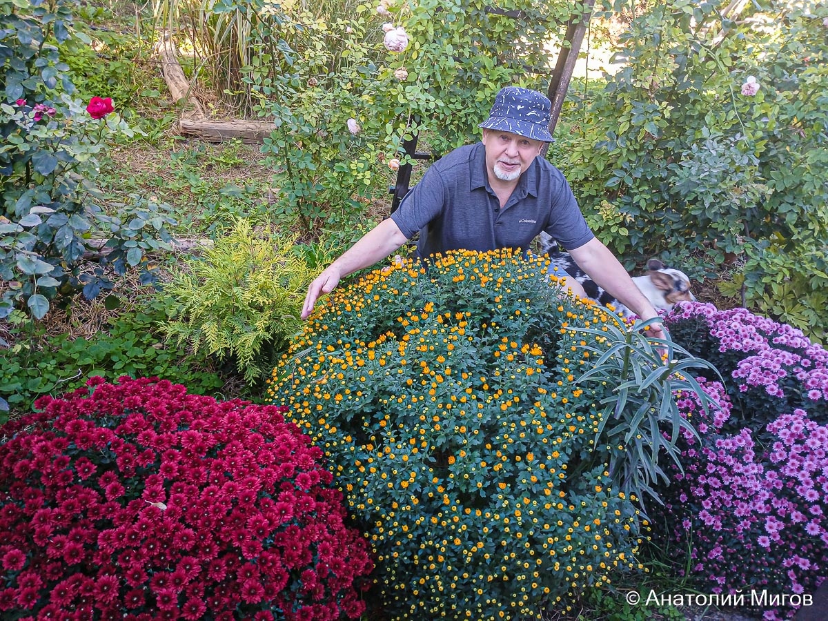 Вчера, перед отъездом в Ялту, не выдержал и пошёл фотографировать наши хризантемы. Подумал, что вот вернемся мы с Леной домой через 10 дней, а они возьмут, да уже сдуются. А тут такая красота и мощь, что никак нельзя мимо пройти. Это шаровидные хризантемы. Они у нас много лет живут. Я каждый год, глядя на них думаю, что это уже пик расцвета, что лучше этого ничего больше не может быть. Но приходит новая осень, а хризантемы становятся ещё роскошнее. Вот уже и обхватить не могу. Самые красивые растут на заднем дворе. Сначала мы их сажали в парадной зоне. Но там розы разрослись и вытеснили хризантемы. Пришлось пересаживать. Несмотря на ослепительную красоту хризантем, розы всё же наши фавориты. Потому что они цветут с мая и почти до нового года, а хризантемы только осенью, в октябре и ещё немного в ноябре. Самая яркая красная. Но уступает в размерах остальным. Лиловая хризантема огромная. Разваливается на несколько кучек. Есть у нас ещё хризантемы, обычные, не шарообразные. Посаженные в