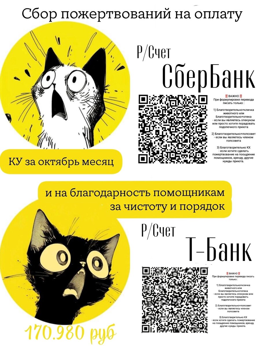 Хорошее утро должно начинаться с добрых дел! Согласны же? И мы попросим сегодня присоединится всех, кто может, хоть понемногу присоединится сегодня к помощи нашим двум приютам Кошачий приют КОТОХАУС 🐈 "НАДЕЖДА" Приют для кошек СПб и помочь нам в сборе на закрытии самых необходимых, жизненно важных затрат приюта за текущий октябрь 2024г. __ ‼️КУ за октябрь (ориентир - квитанции за сентябрь) - 40.980 рублей ‼️ благодарность помощникам за их труд и чистоту в приюте (за период 5 недель с 30.09 по 3.11) - 130.000 рублей. Общая сумма к сбору: 1⃣7⃣0⃣.9⃣8⃣0⃣ рублей‼️ Мы очень просим вас помочь нам. Собрать эту сумму реально, если объединиться, если максимально активно распространять информацию❤🔥 Помочь может каждый любой посильной для него суммой! Пожалуйста, ПОДЕЛИТЕСЬ ЗАПИСЬЮ с друзьями, коллегами, всеми, кто не пройдет мимо😿 ‼ВАЖНО‼ При формулировке перевода писать только (все формулировки без "благотворительно" облагаются налогом!): Благотворительно КХ КУ ✅ Реквизиты для благо