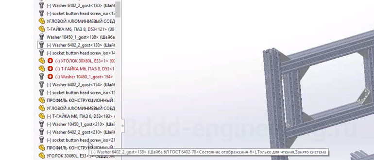 А именно детали и сопряжения помеченные красным, они получились из-за того что мы выполнили диагностику импортирования детали после добавления на сборку и формально старые грани детали удалились и связь потерялась.