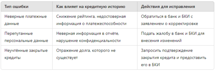 - Ошибки в кредитной истории. Некорректная информация в БКИ, такая как ошибки в данных о заёмщике или перепутанные платежи, может повлиять на кредитную историю.