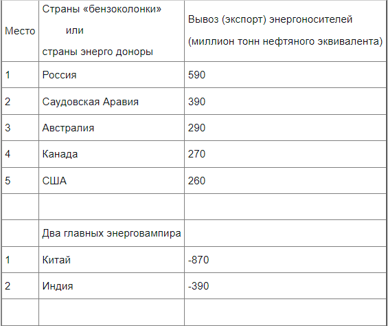 Сразу обрадую народ! Среди стран "бензоколонок" Россия на 1-ом месте!!! !!! А вот у гегемона, то есть у США «жалкое» 5-ое место!!! Причём отрыв России от второго места, от Саудовской Аравии почти двукратный!!! Смотрите в таблице. Топ-5 стран «бензоколонок» в 2023 году. Прим 1. Млн. тнэ – это миллионы тонн нефтяного эквивалента. Данные от европейской конторы ЭнергоДата (www.enerdata.net). Прим 2. Одна тонна нефтяного эквивалента (1 тнэ) это 1010 калорий или 10 миллиардов калорий или 42 миллиарда джоулей. Из таблицы видим, что Россия в 2023 году вывезла из страны 590 миллионов тонн нефти. Точнее нефти, газа и угля в пересчёте на стандартную нефть (на тонны нефтяного эквивалента). Далее в тексте статьи "1 тонна нефти" означает 1 тонна нефтяного эквивалента. *** Так как меня всегда ругают, что я не привожу душевые показатели, то сегодня пойду навстречу "трудящимся АШ-а". В России 150 миллионов человек (округлённо). А в 2023 году Россия вывезла 600 миллионов тонн нефти. Делим 600 на 150