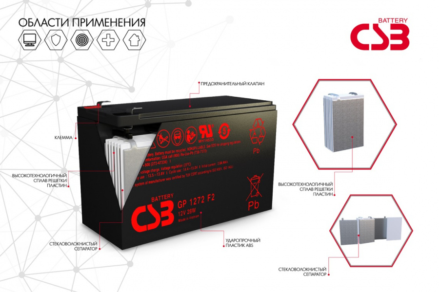 Все аккумуляторы CSB серии GP используют технологию AGM, при которой электролит поглощён в стекловолоконные маты. Это делает аккумуляторы герметичными, предотвращает утечки и гарантирует устойчивость к вибрациям и ударам, что особенно важно для систем, подверженных механическим воздействиям.