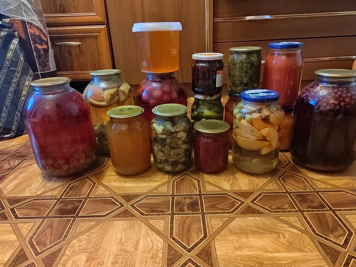 Октябрь месяц, осень, лето было плодотворное. Пчелы хорошо работали, порадовали нас медом, но и мы не теряли время, природа дает нам много разных, вкусных, натуральных продуктов! Изготовили различные компоты с малины, вишни и др, соки яблочные, виноградные, варенье, помидорчки грибочки и огурчики маринованные, свой мед и др заготовки! Сейчас все завалено химией, а сделанное своими руками не только вкусно - но и полезно!