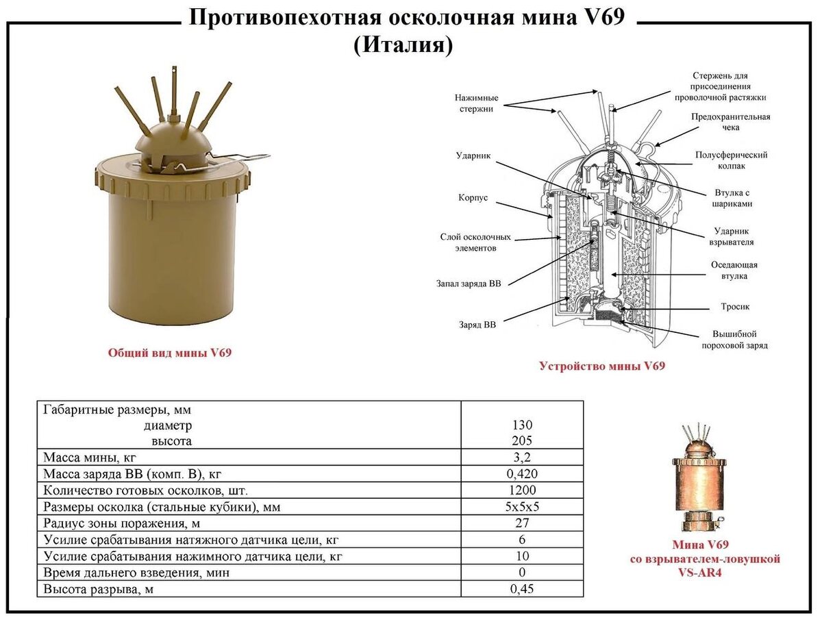 Мина V69 предназначена для поражения живой силы готовыми осколками.