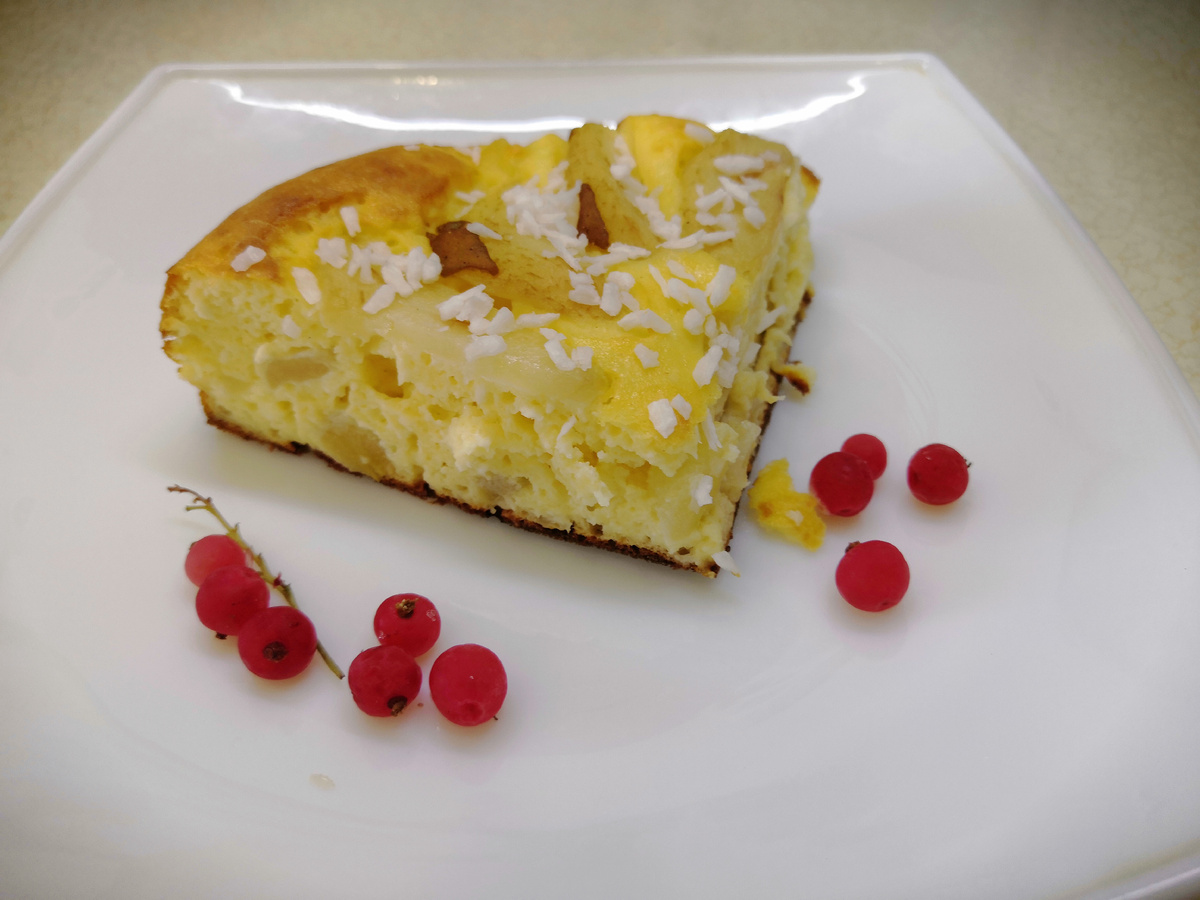 1. Для теста смешать творог, яйца, разрыхлитель и подсластитель. Затем добавить муку и снова хорошо размешать.