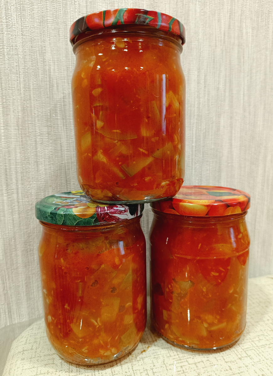 Всем привет 👋 Уже закрываю третью партию соте из кабачков в этом году. Готовится просто и очень вкусная закуска получается. Да и как вариант куда использовать кабачки. Сначала я подготавливаю все ингредиенты, чтобы потом в процессе не возиться с этим. Кабачки, перец и лук нарезаю. Сильно крупно не надо, но и мельчить сильно не советую, а то каша будет. Кабачки нарезаю кубиком в 1.5 см, перец и лук немного помельче. Помидоры пропускаю через мясорубку или измельчаю блендером. В кастрюле сначала нагреваю растительное масло, затем добавляю томатную пасту и несколько минут обжариваю ее в масле. Затем отправляю в кастрюлю кабачки, перемешиваю и тушу 10 минут. Дальше добавляю перец, снова перемешиваю и тушу еще 10 минут. Через 10 минут добавляю лук, помидоры, сахар, соль, чеснок и уксус. Перемешиваю и тушу соте еще минут 15-20. Перед тем, как раскладывать по банкам, обязательно пробую соте на вкус. Если не хватает соли или сахара, то добавляю. Банки и крышки стерилизую. И в сте
