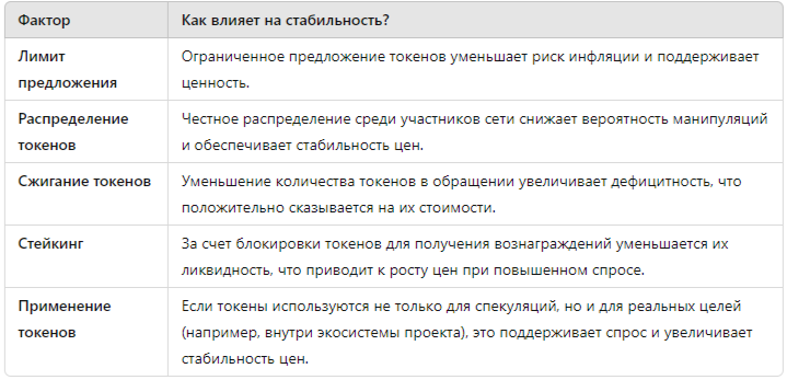 Токеномика играет ключевую роль в обеспечении стабильности криптовалют. Приведем пример нескольких факторов, влияющих на устойчивость проекта: