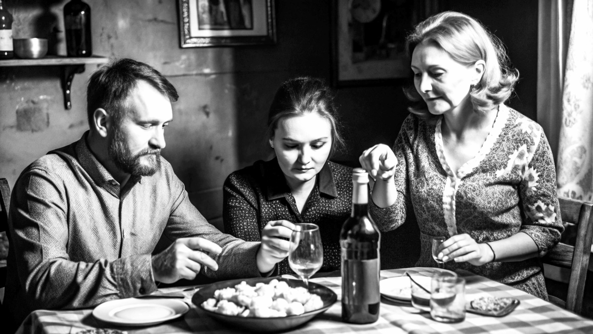 Семья собиралась за столом, как обычно. Тамара Павловна поставила на стол горячие пельмени, а Виктор открыл бутылку крепкой беленькой. Ольга, сидя напротив мужа, потягивала вино и смотрела на него с видом, как будто что-то хотела сказать, но не решалась.