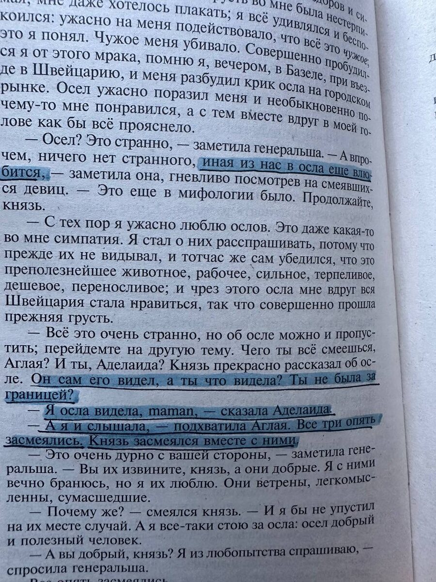 В гостях у Епанчиных князь Мышкин рассказывает, что после обострения падучей его отправили в Швейцарию: «Помню: грусть во мне была нестерпимая; мне даже хотелось плакать; я все удивлялся и беспокоился: ужасно на меня подействовало, что все это чужое; это я понял. Чужое меня убивало. Совершенно пробудился я от этого мрака, помню я, вечером, в Базеле, при въезде в Швейцарию, и меня разбудил крик осла на городском рынке. Осел ужасно поразил меня и необыкновенно почему-то мне понравился, а с тем вместе вдруг в моей голове как бы все прояснело». В этот момент сестры Епанчины начинают смеяться, поясняя, что они сами и видели, и слышали осла. Для жителей Центральной России в XIX веке осел был диковинным животным. Узнать, как он на самом деле выглядит, можно было из книг — например, из описаний путешествий по среднеазиатским регионам и южным странам. В Петербурге ослов наравне с дикими козами и другими редкими экспонатами помещали в зверинцы — небольшие передвижные или стационарные зоопарк