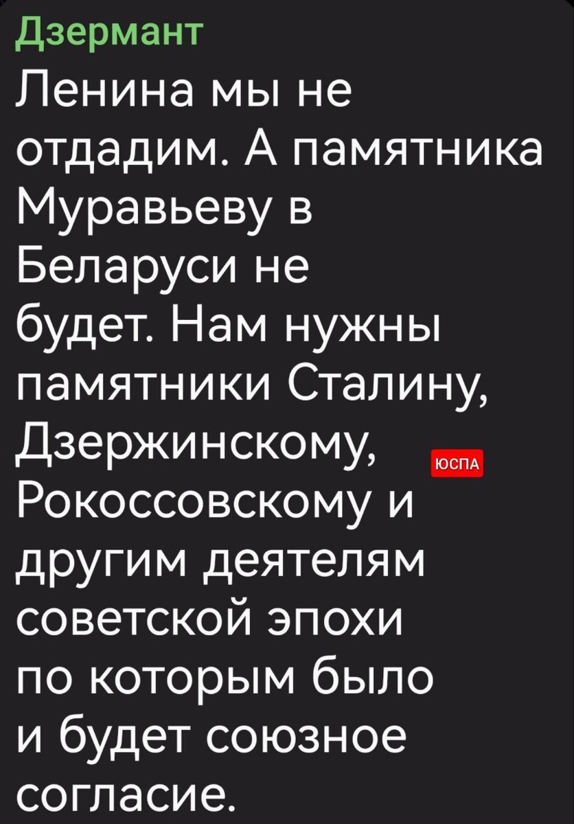Неоязычник Алексей Дзермант выступает категорически против установки памятника Муравьеву, который остановил кровавый геноцид русского народа, осуществлявшийся поляками на протяжении столетий, о чём, кстати, говорил и А. Г. Лукашенко. Данные слова сразу нашли отклик в белорусизаторской сетке, чьи шляхетские повествовательные линии и американские следы видны невооружённым взглядом. Взамен Муравьёву эксперт предлагает увековечивать Сталина и Дзержинского, однако, ярких инициатив на этот счёт от коммуниста Дзерманта, мне на глаза не попадалось. Возможно, что я плохо смотрел. А вот желание ещё более возвысить через скульптурные композиции и барельефы национального исторического музея поляка Франциска Богушевича, занимавшегося в интересах Польши белорусизацией на русских землях современной Беларуси, в сообщениях гражданина Дзерманта и его попутчиков видно отчётливо.