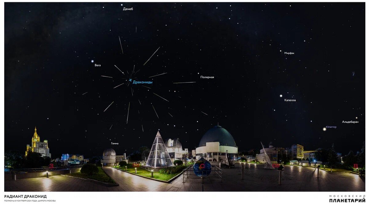 8 октября максимума своей активности достигнет метеорный поток Дракониды (ZHR~5, всплески до ZHR~100-400) Пик активности ожидается примерно в 16:00 по московскому времени 8 октября 2024 года. Дракониды это периодический поток, действующий ежегодно с 6 по 10 октября, давший за последнее столетие два коротких впечатляющих звездных дождя в 1933 и 1946 гг., случаются иногда всплески от 20 до 500 метеоров в час. В 1998 году кратковременная вспышка активности достигала 700(!) метеоров в час и наблюдалась на Дальнем Востоке и в Сибири. Родоначальница потока комета 21P/Джакобини-Циннера, когда она близка к перигелию, случаются такие яркие вспышки активности и метеорные дожди. Название Дракониды происходит от созвездия Дракон, в котором находится радиант этого потока. Радиант точка на небе, откуда, как кажется наблюдателю, вылетают метеоры. Метеоры Драконид красноватые и очень медленные, эта характеристика помогает отделить подлинные метеоры потока от случайных метеоров. В октябре после захода
