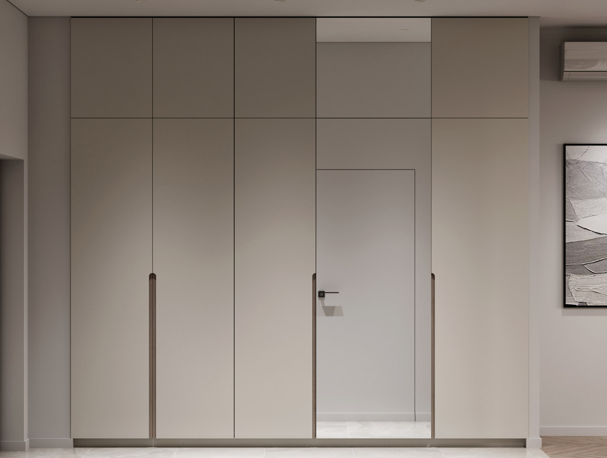 Интерьер прихожей 7,4 м² выполнен в минималистичном стиле и в светлой цветовой гамме, стены окрашены в светло-серый цвет. До потолка возвышается встроенный шкаф, одна из дверей которого оклеена зеркалом, неожиданное решение, которое визуально расширяет пространство узкой прихожей. Пол покрыт светлым керамогранитом, имитирующим натуральный камень. В нише со стеклянной стеной расположился подвесной столик из шпона дерева и мягкий пуф с клетчатой обивкой. Дополняет композицию зеркало, которое отражает свет и придает пространству дополнительный объем. Для локального освещения с потолка свисают дизайнерские светильники с абажуром из черного стекла. Дверь скрытого монтажа, окрашенная в цвет светло-серой стены, ведет в гостевой санузел. Дверь скрытого монтажа — это конструкция, которая устанавливается вровень со стеной и практически незаметна в интерьере. Полотно такой двери плоское, без наличников, и часто повторяет отделку стены. Это решение подходит для минималистичных интерьеров и позволя