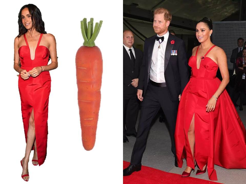 Меган решила работу дизайнера усовершенствовать – широкую юбку убрала. Силуэт изменился. Новый силуэт напоминает морковь – самая широкая часть сверху, даже намека на талию не видно, сухие бедра и ноги. Для усиления сходства с овощем она высовывает в разрез спереди свою ногу «длиной в милю».