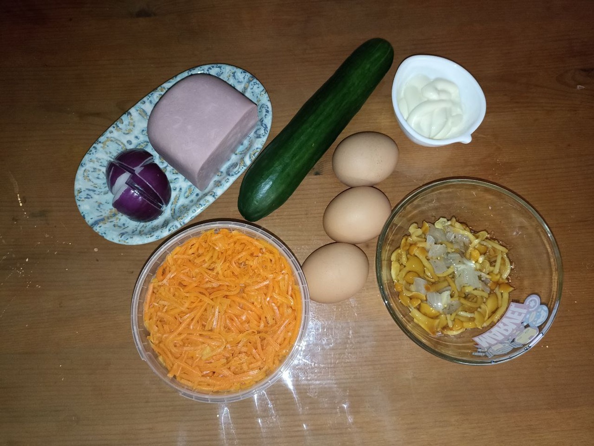 Сегодня будем готовить один из самых простых, но при этом очень вкусных салатов. Такой подойдёт как для обычного обеда или ужина, так и на праздничный стол. Ваши гости точно попросят у вас рецептик! Все ингредиенты можно купить в любом магазине у дома, поэтому готовка не займет у вас много времени. На один салатник (примерно 500 г) нам понадобятся следующие ингридиенты: Приступим к приготовлению: 1. В первую очередь необходимо сварить яйца до готовности. Для этого кладём яйца в кастрюлю, набираем холодной проточной воды так, чтобы она полностью покрыла яйца и плюс 2 см сверху. Ставим на большой огонь. После закипания уменьшить огонь до среднего и варить 10 мин. Затем остудить яйца в холодной воде. 2. Пока яйца варятся нарезаем ветчину кубиком 3. То же самое проделываем с огурцом 4. Чистим отварные яйца и режем их мелким кубиком 5. Добавляем маринованные опята. Но перед этим их необходимо освободить от лишней жидкости. Для этого положите сначала опята на сито или дуршлаг (желательно н
