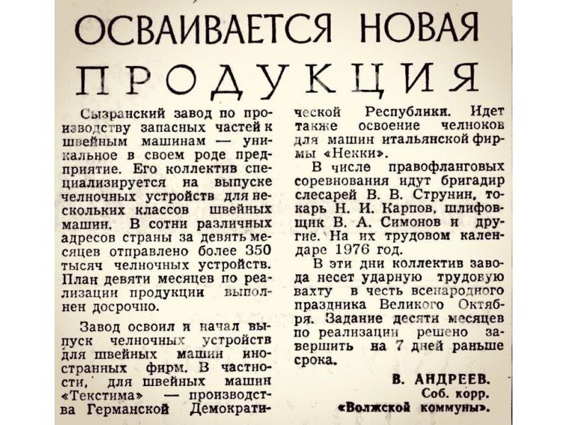 Возможно, взгляды кого-то из прохожих «цепляет» забор, огораживающий развалины корпусов на улице Карла Маркса, 20. А здесь, еще четверть века назад, находилось предприятие, о котором мало кто сейчас вспомнит и которое было утрачено нашим городом в конце 90-х гг XX века - начале 2000 гг, как и десятки других. В Сызрани производили запчасти к швейным машинкам, а на Карла Маркса, 20 числился юридический адрес предприятия. Завод по производству запасных частей к швейным машинкам сначала был сызранской артелью Искра. Он был создан в военном 1941 году и просуществовал так до 1956 года. А затем, 1 октября 1956 года, стал полноценным заводом запасных частей к швейным машинам Сызранского многопромсоюза. 60 лет назад сызранский завод освоил новую продукцию на экспорт и стал производить запчасти к машинкам для иностранных фирм. Его несколько раз переименовывали; завод выпускал запчасти к знаменитым машинкам Подольск. После перестройки сызранский завод пытался выжить. Он даже стал в 1995 году заво