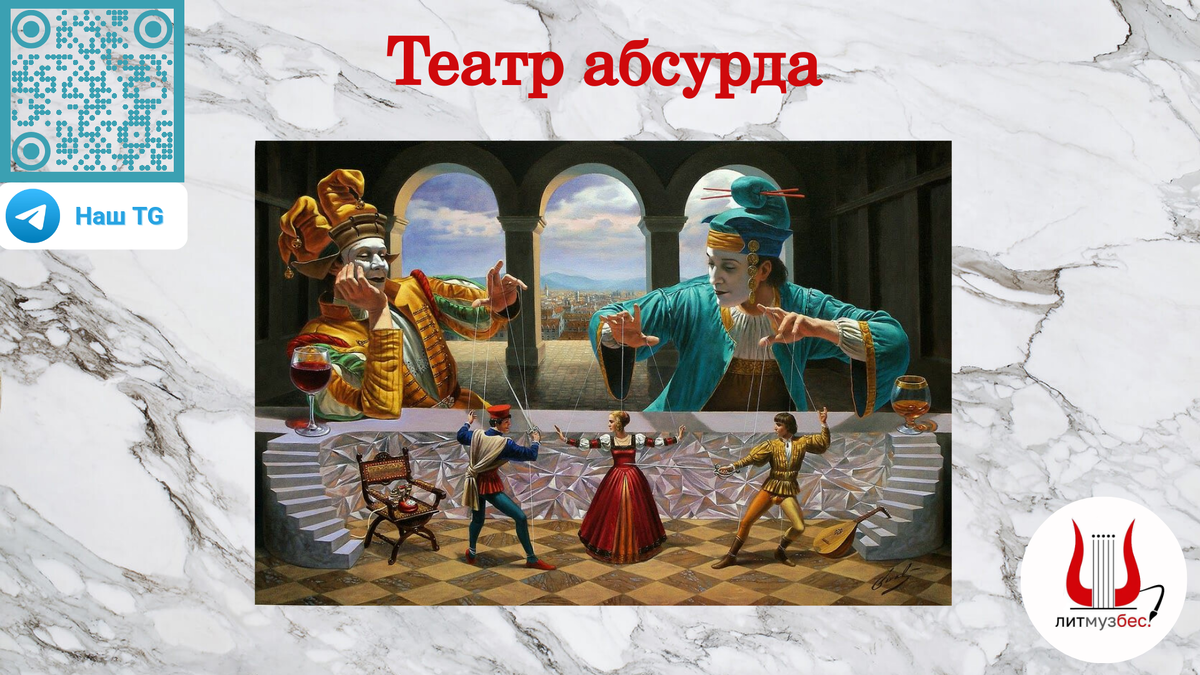«Театр абсурда» — это название некоторых театральных произведений, которые родились и создавались в Париже в начале 1950-х годов. Такое определение дал этому театру английский критик Мартин Эсслин, который увидел в определенных произведениях художественное воплощение философии Альбера Камю о бессмысленности жизни в своей основе. Несмотря на острую критику, жанр приобрел популярность после Второй мировой войны, которая указала на значительную неопределенность человеческой жизни. ______________________________________________________________ _______________________________________________________________ Считается, что театр абсурда отвергает реалистичных персонажей, ситуации и соответствующие театральные приемы. Время и пространство становятся неопределенными и изменчивыми, разрушаются простейшие причинно-следственные связи. Что же касается драматической непоследовательности в пьесах «абсурда», то она практически полностью соответствует «клиповому» восприятию современного человека, чей