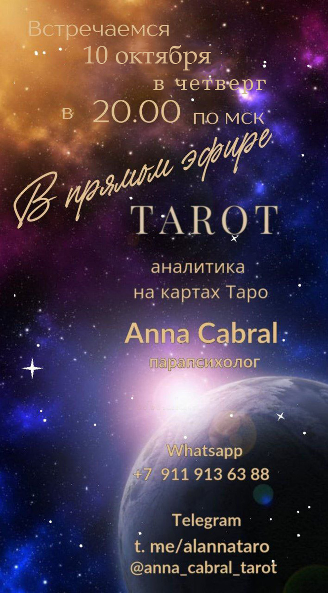 Дорогие мои, приглашаю вас на прямой эфир, который состоится 10 октября в 20.00 на моём телеграм канале. У вас будет возможность задать свой вопрос и получить развёрнутый ответ. Советы карт и просто разговор по душам. Буду рада всем!
