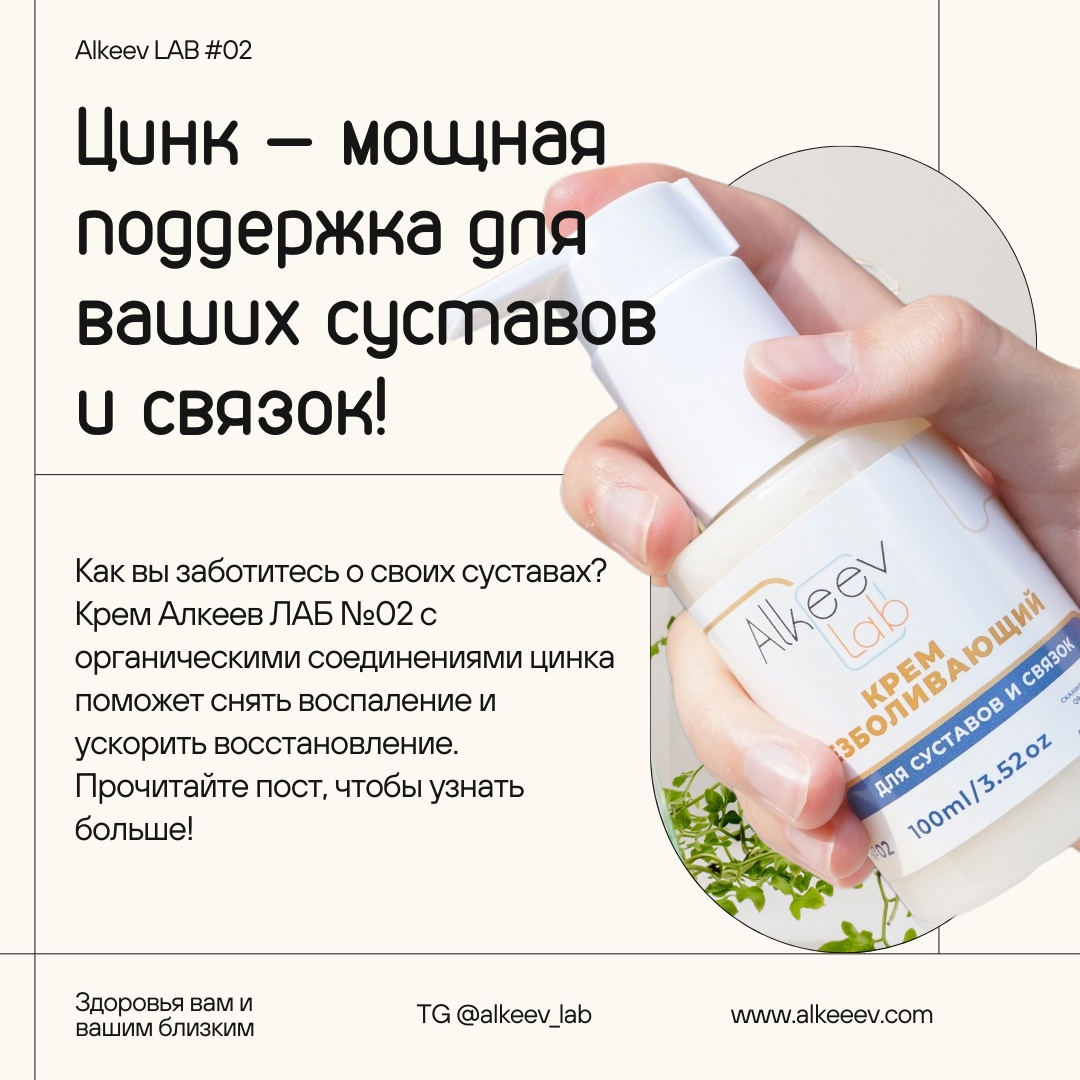 Но что делает его таким важным? Органические соединения цинка оказывают значительное воздействие на здоровье опорно-двигательной системы, улучшая состояние суставов и восстанавливая их функции. Когда вы используете крем с органическими соединениями цинка, как Алкеев ЛАБ №02, вы даёте своим суставам и связкам мощный стимул к восстановлению. Как работают органические соединения цинка в креме Алкеев ЛАБ № 02: На основе полученных нашими учеными исследовательских данных мы рекомендуем применять крем Алкеев ЛАБ №02 два раза в день с интервалом не менее 6 часов. Так вы сможете улучшить подвижность суставов, снять боль и ускорить процесс восстановления. Позаботьтесь о здоровье своих суставов и поделитесь этой постом с друзьями, близкими и родными! Помогите им узнать о полезных свойствах цинка в креме Алкеев ЛАБ и сделать первый шаг к крепким и здоровым суставам.