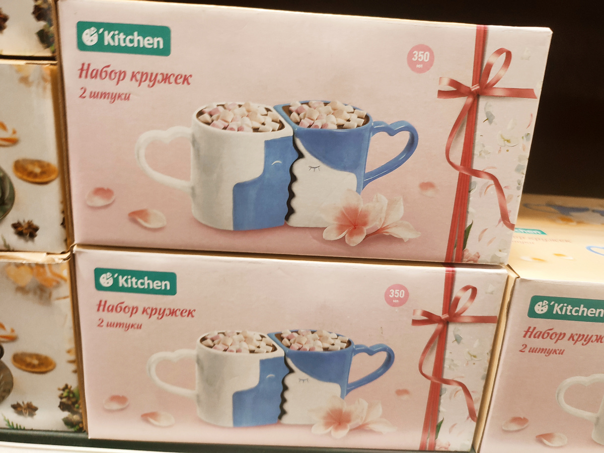 Набор кружек создан для романтических чаепитий! В наборе 2 кружки в виде целующейся пары, с ручками-сердцами. Объём кружки каждой кружки 350 мл. Состав: фарфор. У меня такое ощущение, что я видел их в продаже к 14 февраля... У нас таких уже нет, а здесь все еще продаются))