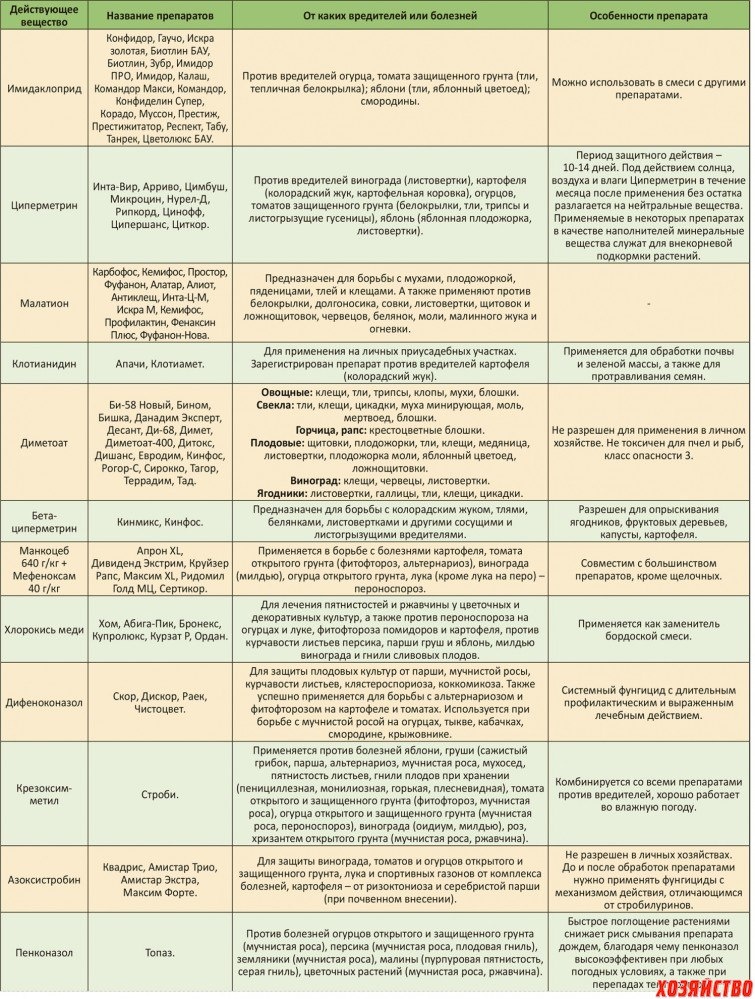 В продаже сейчас полно всевозможных препаратов от вредителей и болезней. Зачастую мы покупаем препараты, в состав которых входит одно и то же действующее вещество. И что получается?Чередуя эти препараты при обработках сада, мы получаем обратный эффект: вредители и болезни приспосабливаются к этому веществу и обработки оказываются безрезультатными. Мы предлагаем вам таблицу, которая поможет вам разобраться в разнообразии препаратов и не наделать ошибок. Обязательно сохраните ее для себя.