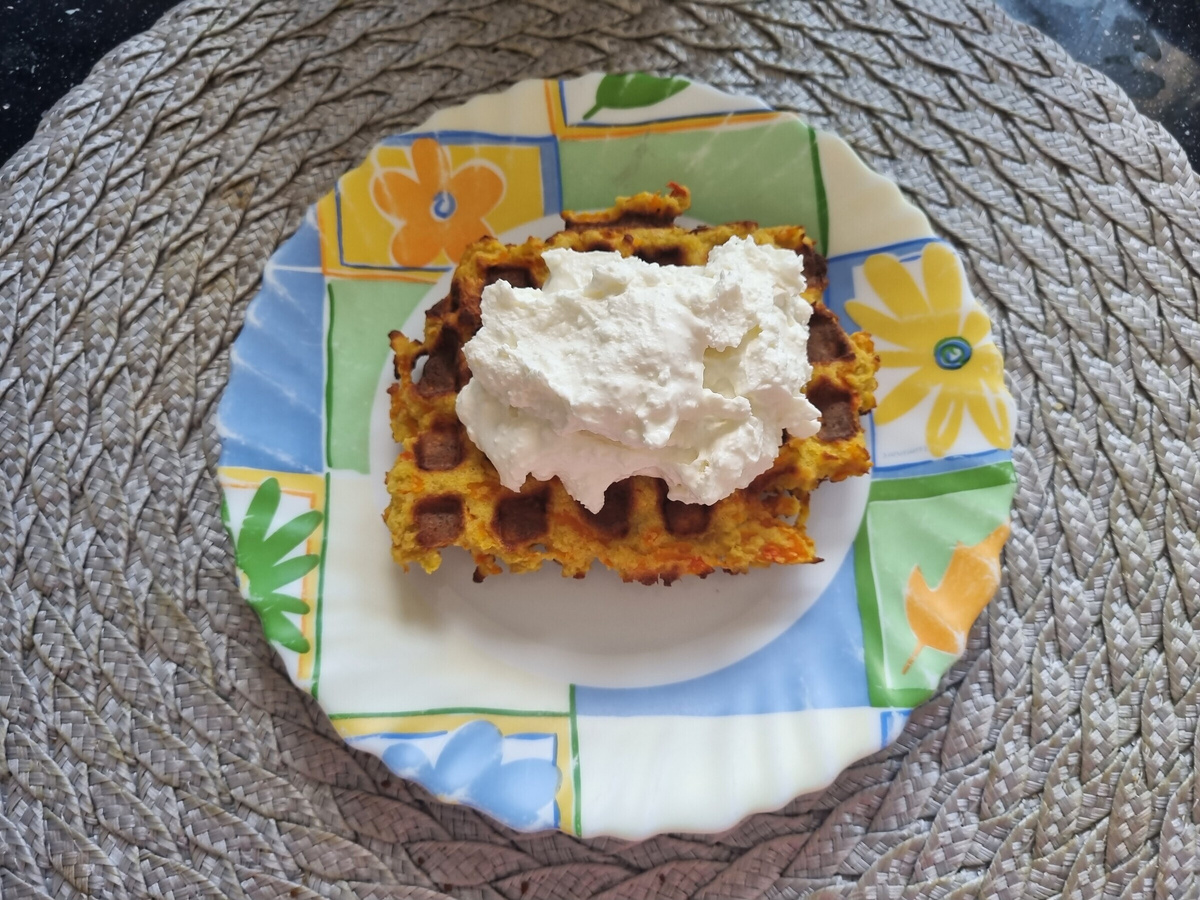 В составе: остатки тыквы, половинка маленькой баттернат, одно большое сладкое яблоко, 1 яйцо, большая ложка сметаны, пол чайной ложки соды и миндальная мука до теста как на оладьи. Я добавила ещё 2 капельки стевии, ну чтобы точно были десертными)) Тыкву и яблоко трем на крупной тёрке, потом все остальное к ним домешиваем. Вафли получаются мягкие. С творожным кремом самое оно))), настоящий десерт. Творожный крем - это взбитый творог со сметаной и стевией.