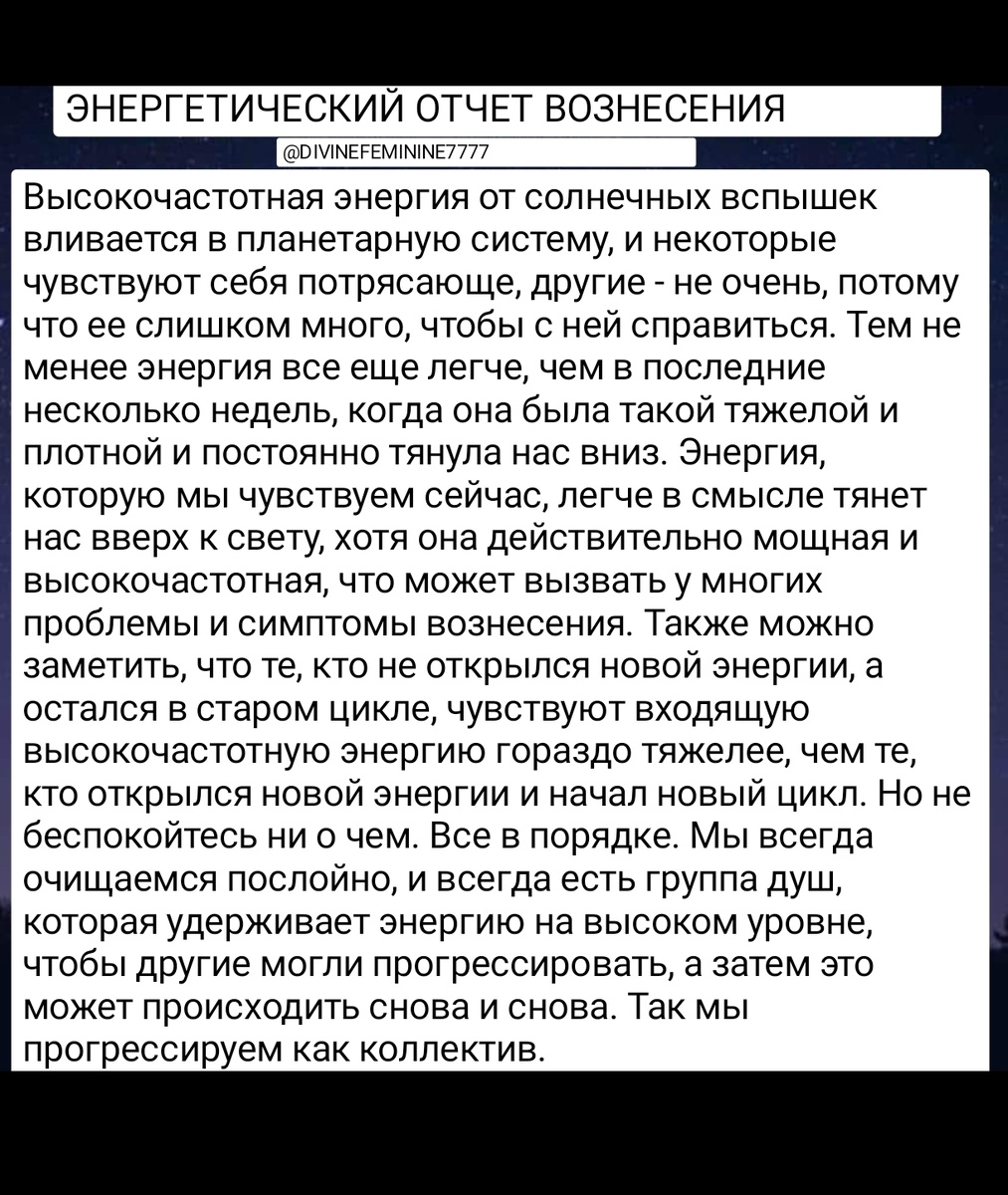 За последние 24 часа произошел огромный сдвиг в нас самих и в коллективной энергии. Ранее Восходящие прошли фазу очищения, а теперь переходят к другой важной стадии активации. За это время они получают множество сильных световых кодов, обновлений и загрузок. Происходят интенсивные активации сердечной и горловой чакр, а также сильные симптомы Вознесения. Любые оставшиеся блокировки в энергетических полях поднимутся на поверхность, чтобы трансмутироваться и трансформироваться на следующем этапе Вознесения. В течение текущего периода пустоты Вознесения восходящий может испытывать чувство онемения, спокойствия и ощущение неполного присутствия в какой-либо реальной реальности. Иногда это может сопровождаться утомлением и опустошенностью. Эта стадия приостановки — это время более глубокого исцеления, настройки света, активации и перекалибровки энергетической системы, что приводит к появлению новых и улучшенных даров и способностей души. Возносящиеся личности существуют во многих