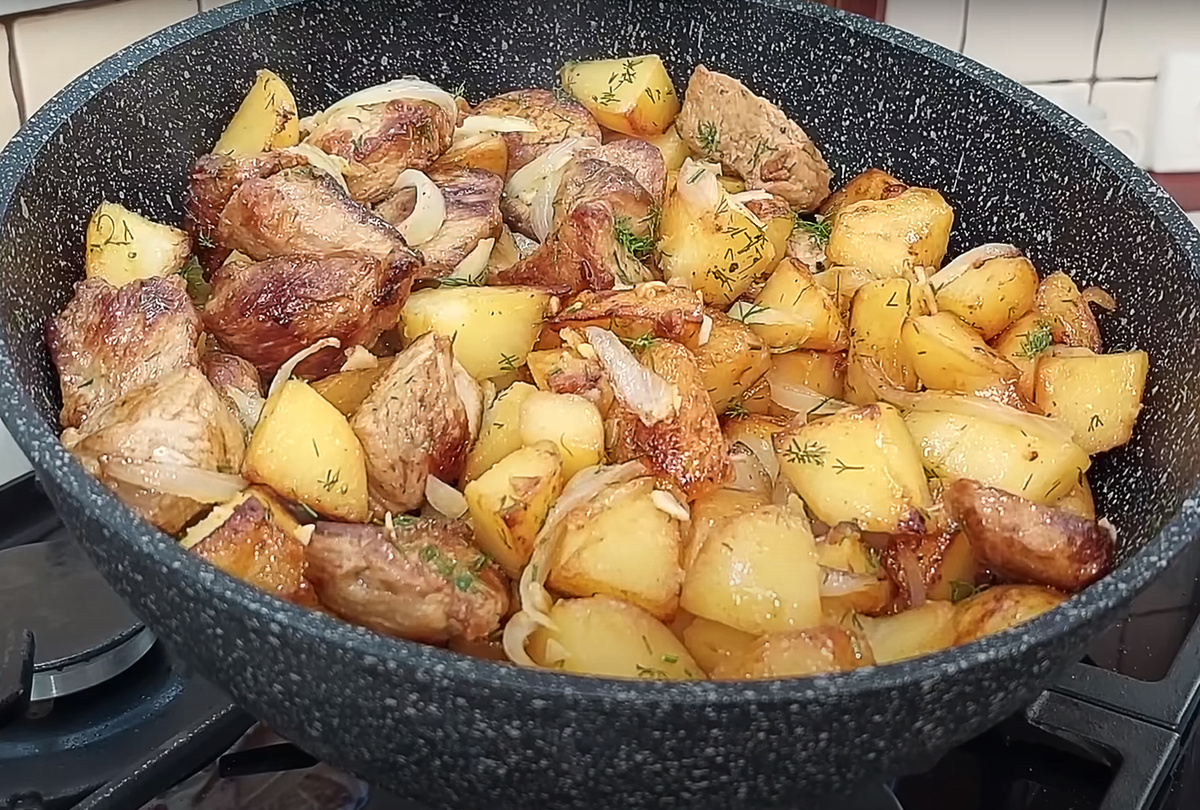 У меня есть примерно 500–600 граммов телятины. Нарезаю ее на кусочки — чем нравится телятина, так это тем, что она готовится очень быстро. Мясо отправляю на раскаленную сковороду. Пока мясо обжаривается на максимальном огне до полуготовности, беру лук. Нарежу его на крупные лепестки — пусть каждый сможет его увидеть и выловить с тарелки (если не любит лук) . Подготовлю пару зубчиков чеснока — раздавлю и измельчу ножом. Переворачиваю мясо и даю ему еще немного времени, а пока займусь картофелем. Нужно 6–7 крупных картофелин. Нарезаю их довольно грубо — раз-два, и готово. Хорошо промываю картошку, выкладываю на чистое полотенце, пусть обсохнет. Теперь добавляю еще ложечку жира на сковороду и выклады