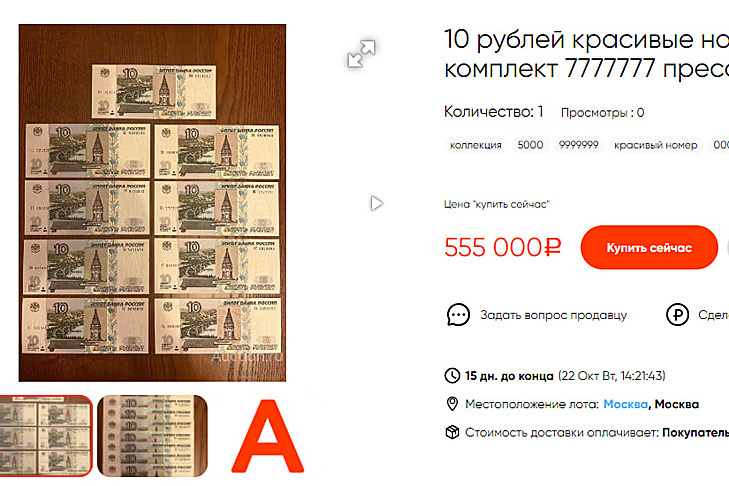 Повезет ли жителю областного центра продать находку за столь внушительную сумму, покажет время. На сайтах продаж купюр подобный товар стоит гораздо дешевле, на глаза попалась десятирублевая купюра со всеми «пятерками», ее продавец оценил всего в 22000 рублей. Сторублевку с «шестерками» другой продавец предлагает за 16 000. Дорогая купюра в 10 рублей с «семерками» другой серии продается в Москве – там она стоит 555 000 рублей.