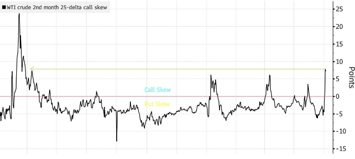 На прошлой неделе фьючерсы на нефть показали самый большой рост более чем за год. На рынке опционов ажиотаж был еще больше Перекос колл-опционов на нефтяные фьючерсы. Источник: Bloomberg Поскольку трейдеры опасались значительного скачка цен, перекос колл-опционов на фьючерсы West Texas Intermediate второго месяца подскочил до самого высокого уровня с марта 2022 года, когда начало конфликта между Россией и Украиной вызвало опасения, что миллионы баррелей нефти в день от одного из крупнейших мировых производителей внезапно исчезнут с рынка. В поразительном повороте событий хедж-фонды, консультанты по торговле сырьевыми товарами и другие управляющие деньгами поспешили изменить позиции, которые в середине сентября стали медвежьими по отношению к нефти из-за опасений, что замедление экономического роста в Китае и других странах сократит спрос как раз в то время, когда производители ОПЕК+ готовятся увеличить предложение. Около двух недель назад объем пут-опционов достиг пика: трейдеры платил