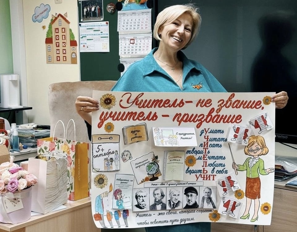 Классному руководителю 1 «А» Наталье Николаевне Осиповой родители подарили открытку-плакат, сопроводив её пожеланием: «Дорогие наши учителя! Мы от всей души шлём вам тёплые поздравления в этот чудесный, один из самых главных, возможно, праздников в году! С Днём Учителя! Спасибо вам за то, что так тепло приняли наших первоклашек! За то, что каждый день щедро делитесь своей энергией, опытом и знаниями с ними! За то, что, благодаря вам, наши малыши познают мир и видят его через призму правильных ценностей! С благодарностью и пожеланиями здоровья и заряда сил! 1 «А» класс». А классному руководителю 4 «Б» Юлии Валерьевне Беловой её ученица Маша Д. вместе с ребятами сделала целое поздравительное видео. Традиционно в День учителя проходит ДЕНЬ ДУБЛЁРА. Это