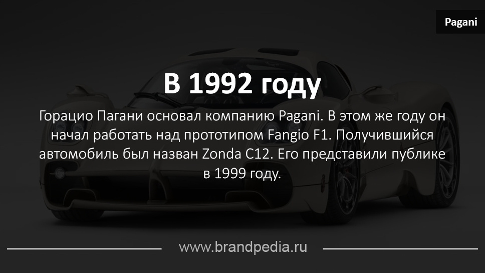 1992 год стал переломным моментом. Горацио основал свою автомобильную компанию — Pagani Automobili S.p.A. Именно тогда началась работа над первым прототипом, который впоследствии стал известен как Zonda C12. В 1993 году автомобиль прошёл аэродинамические тесты в лабораториях Dallara, и стало понятно: это будет не просто машина, а новое слово в мире гиперкаров. Mercedes-Benz подключился к проекту, предложив свои двигатели V12. Однако смерть Хуана-Мануэля Фанхио в 1995 году заставила Пагани отказаться от первоначального названия Fangio F1. В итоге автомобиль получил новое имя — Zonda.