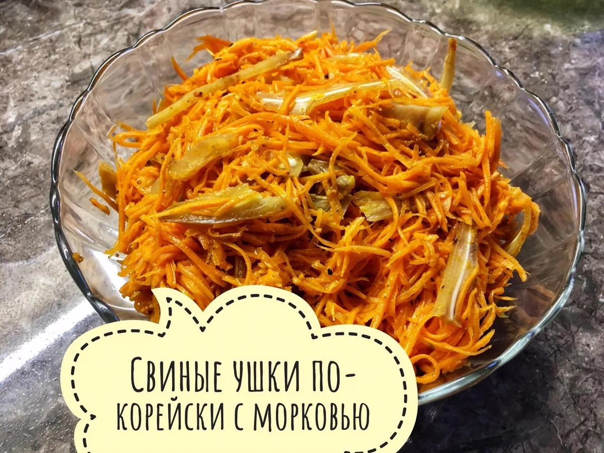 🥕+🥠=Быстрый и вкусный салатик из свиных ушей по-корейски с морковкой – это изысканное блюдо для настоящих ценителей экзотической азиатской кухни. Ингредиенты: 2 моркови Заправка для корейской моркови СэнСой Ухо свиное, маринованное и запечённое на гриле. Приготовление: 1. Ушки свиные вымачиваем, чистим хорошо, маринуем и готовим на гриле до готовности. Приготовленное ухо режем тонкой соломкой. 2. Укладываем в кастрюльку порезанные уши, добавляем заправку для корейской моркови Сэн Сой. 3. На специальной терке измельчаем морковь полосками, чтобы получилась тонкая, как корейская. 4. Далее выкладываем в кастрюльку к ушам и заправке. Чеснок выдавливаем в эту же емкость немного по вашему вкусу (я делала без него). Все перемешиваем и ставим в прохладное место на 5-6 часов, чтобы в салате все вкусы «поженились»)) Остренький, сытный и пикантный получается. Приятного всем!!