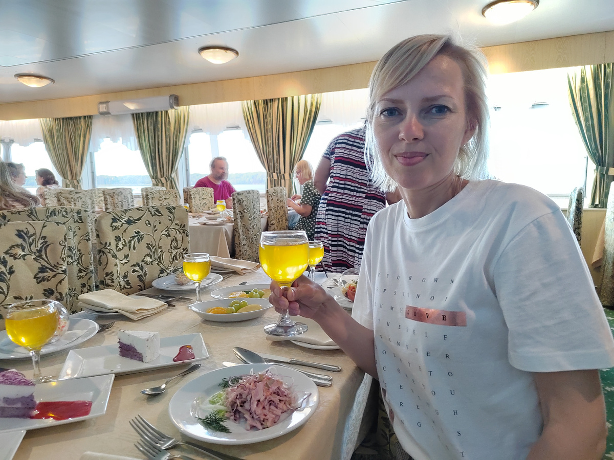 Но при этом все равно все старались сохранять оптимизм, за столом много разговаривали, попались хорошие сотрапезники. Торопиться все равно было некуда, ибо куда с теплохода убежишь. Поэтому за нашим столом это ожидание не особо раздражало.