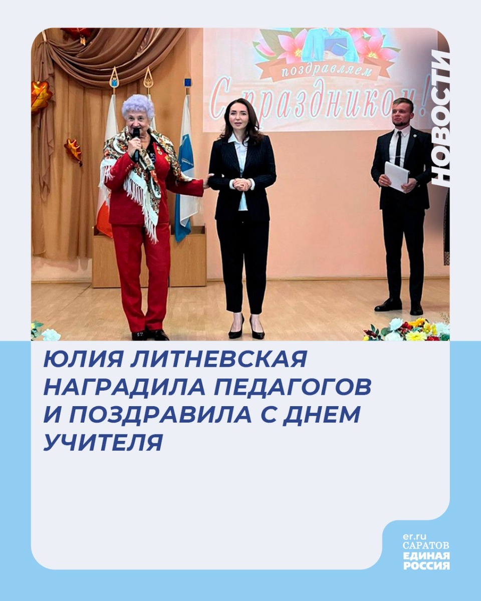 📚 5 октября педагоги отметили профессиональный праздник. В преддверии Дня учителя депутат Саратовской областной Думы, региональный координатор проекта «Историческая память» партии «Единая Россия», председатель Саратовского регионального отделения «Союза женщин России» Юлия Литневская поздравила учителей и всех дошкольных работников. 🏫В Октябрьском районе торжественное мероприятие состоялось в школе №95. В зале собрались педагоги, руководители образовательных организаций, ветераны педагогического труда, воспитатели, молодые специалисты, почетные гости. Лучшие из лучших получили награды. Юлия Литневская наградила почетной грамотой Саратовской областной Думы лицей №62 за достижение высоких показателей в воспитании и образовании. Платок Саратовского регионального отделения «Союза женщин России» депутат вручила почетному гражданину региона, педагогу, заслуженному работнику физической культуры Тамаре Тупиковой. 🎶Энгельсский муниципальный район чествовал учителей в школе им. Ю. А. Гага