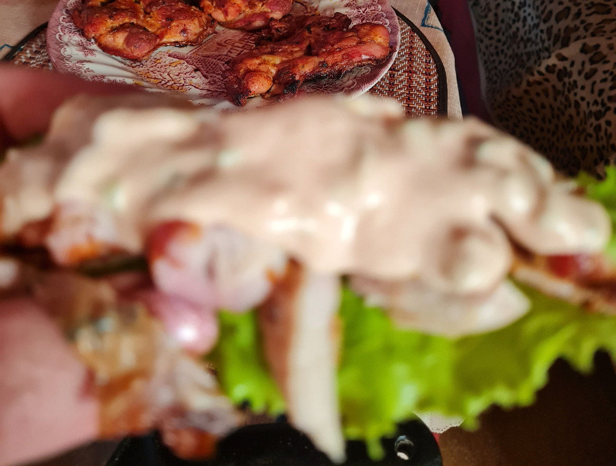 Идея приготовления этих очень вкусных бутебродиков пришла мне в голову на даче, ну и там же и воплотилась в жизнь. Дома я их тоже теперь делаю. Итак нам понадобится: - филе куриного окорочка (я беру окорочка и снимаю с кости филе) - соль, перец, приправы по Вашему вкусу - майонез 3 столовые ложки - чеснок 2 зубчика - томатная паста Берем филе куриного окорочка, солим, перчим по вкусу, оставляем на пару часов промариноваться (можно больше) Далее отправляем филе в разогретую до 200 градусов духовку, примерно на полчаса (на даче пользовалась тандыром), готовое куриное филе нарезаем в произвольном порядке. Пока готовится филе, делаем соус. Трем чеснок на мелкой терке, добавляем мелко рубленый соленый огурчик (на самом деле не обязательно, огурчик можно добавить и на сам бутерброд), майонез (у меня слобода оливковый, можно сделать свой майонез), томатную пасту (у меня маминого приготовления), немного соли и перца, все тщательно перемешиваем. А дальше, как Ваша фантазия позволит: можно на хл