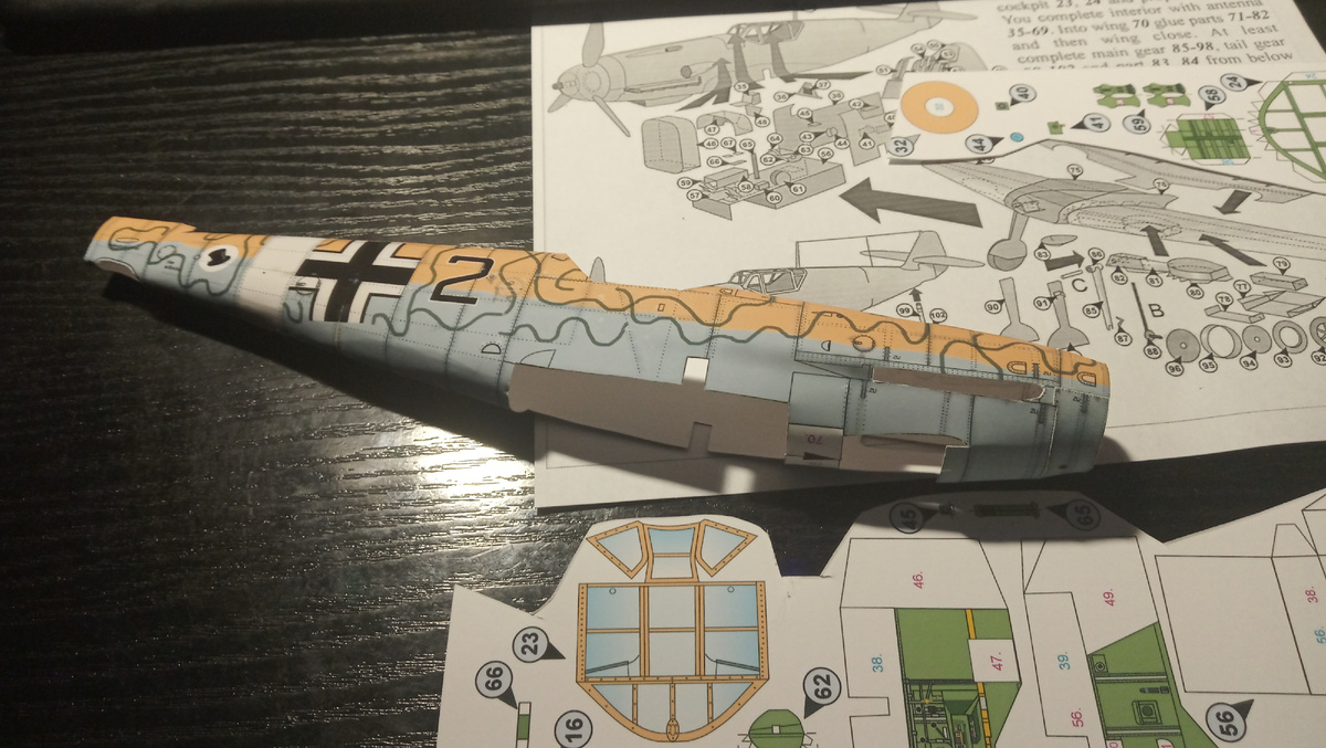 Собрал очередную модель из бумаги от "PaperModels". Масштаб 1/35. Распечатана в салоне на матовой фотобумаге А4 на струйнике. Три листа в цвете, четвертый с инструкцией на обычной бумаге на лазернике. Bf 109G-2 строился с мая по декабрь 1942 г. Этот отличается не только тропическим камуфляжем, но и наличием дополнительного воздушного фильтра. Что примечательно, модели этой фирмы собираются не как классические - методом склеивания цилиндрических кусков фюзеляжа, а фюзеляж состоит практически из одной хитрой детали и соответственно имеет минимум швов. Ссылка на скачивание в конце поста. Подошло всё более-менее хорошо. Кое-где подкрашено акриловыми красками, а сверху покрыт акриловым лаком. Пара нюансов - боковые стенки кабины надо сразу клеить внутрь фюзеляжа, отрезав всё белое (иначе остальное не впихнёте). Я зря собрал её целиком - пришлось разрезать. Обрешетка кабины - снаружи одной деталью, внутреннюю пришлось разрезать на несколько частей и подгонять. Иначе не лезла. Внутри крыла ло