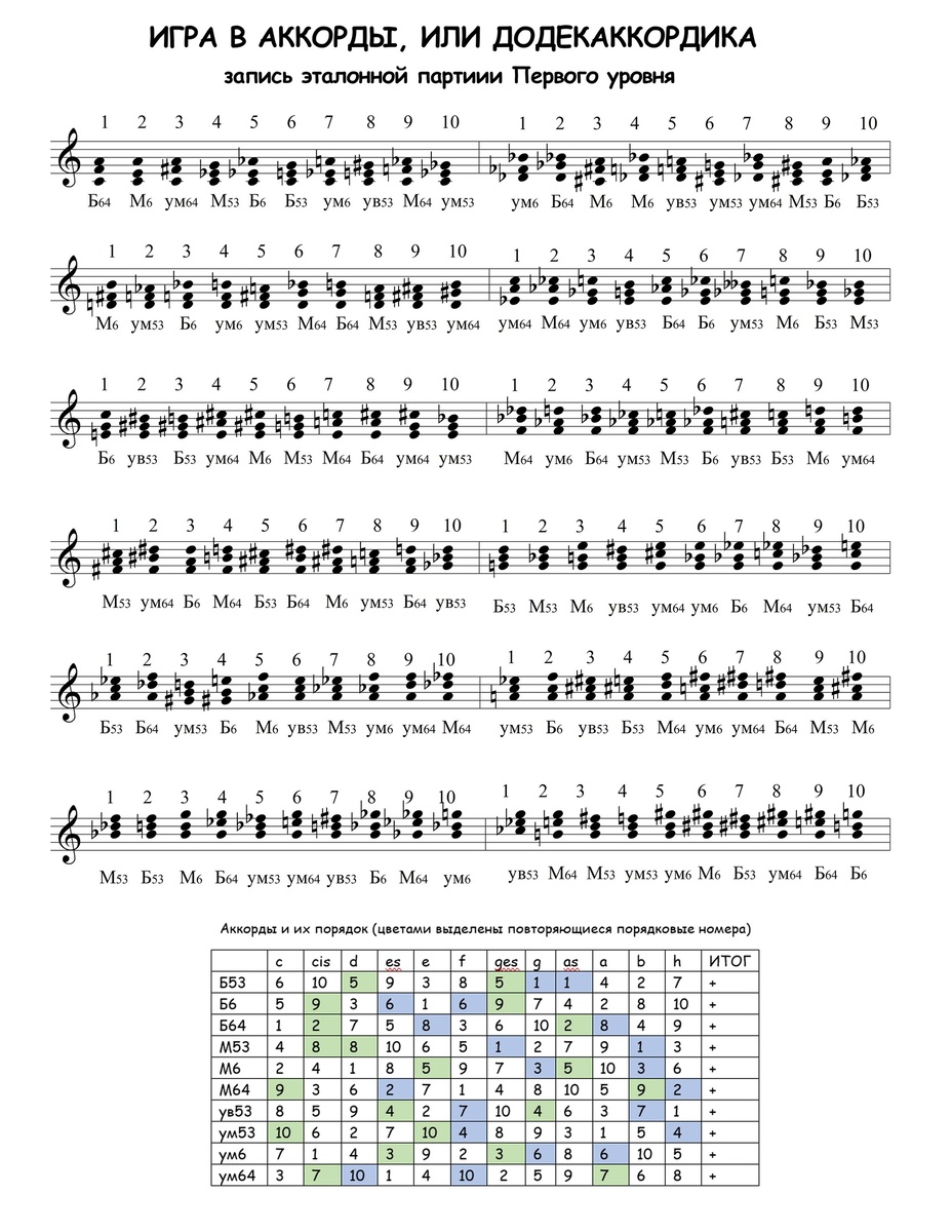 Представляем Вашему вниманию одну из самых сложных игр в мире, где требуется комбинаторика шахматиста, скорость пинг-понгиста и всё это в сочетании с игрой на музыкальных инструментах, которая зачастую отключает и логику, и скорость мышления. Назвать её можно соответствующе: например, "додекаккордика." Или просто "Игра в аккорды". Суть игры кажется простой: от 12 нот подряд надо играть один и тот же набор аккордов – для начала все трезвучия с обращениями, только всё время при игре меняя порядок этих аккордов. И играть надо как можно быстрее.