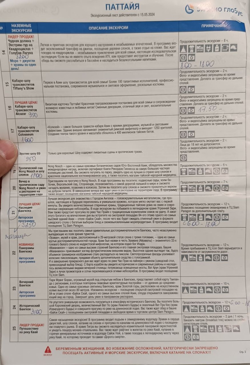 Вот перечень всех экскурсий от туроператора Библио-Глобус и описание с указанием стоимости некоторых (подписано рядом ручкой, цена в Батах за одного человека).
