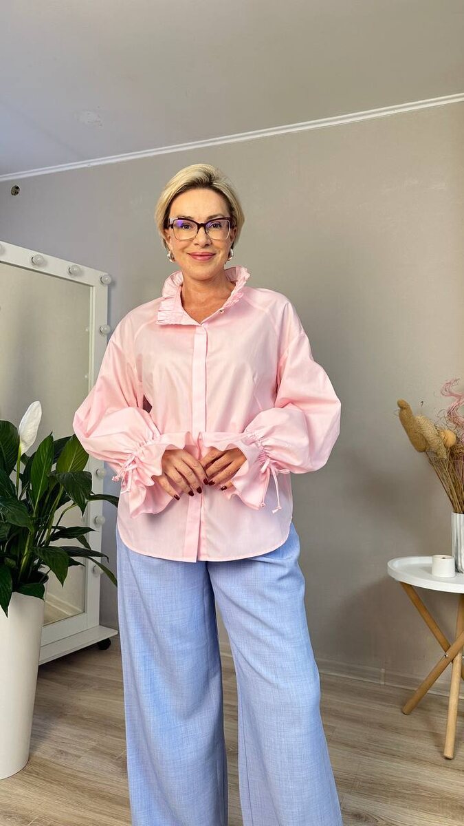 Здравствуйте, дорогие читатели! Я очень люблю красивые и необычные рубашки и блузки и очень рада, что сейчас в моде пышные рукава, воланы, цветы и прочие интересные детали. В этой статье поделюсь с вами тремя новинками из своего гардероба. Не забывайте ставить лайк за мои старания! Рубашка нежно-розового цвета с пышными рукавами на резинках. Женственный воротник-стойка с красивой пуговкой делает ее еще более нарядной и женственной. Остальные пуговицы скрыты планкой. Мне очень нравится цветовое сочетание образа. А вам как? Рубашка идеальна для составления современных романтичных образов как с юбками, так и с брюками. Вторая рубашка красива сама по себе благодаря глубокому оливковому цвету. И даже рукава 3/4 ее не портит. Однако модель не так проста, как может показаться... У нее есть красивая съемная деталь, которую можно совершенно по-разному использовать в своих образах. И, конечно, носить и с другими вещами. Только посмотрите, сколько вариантов применения! Например, как баска... В ка