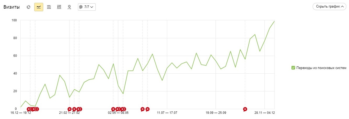 Клиент пришел ко мне с относительно новым сайтом на платформе megagroup. Я сразу понял, что в текущем виде сайт будет продвигать тяжело (из-за ограниченного функционала конструкторов), и мы сделали разработку полной копии сайта на wordpress. Сайт мы разработали уже с учетом коммерческих факторов тематики. Я собрал полное семантическое ядро ниши и начал создавать и оптимизировать новые страницы. Изначально, на сайте было всего несколько страниц и трафика практически не было. Работа активно велась, но на протяжении 3 месяцев трафик не рос, видимости не было. Мы решили подлить трафик с Директа, чтобы дать сайту поведенческие показатели. Это дало свои плоды, через 2,5 месяца видимость резко взлетела вверх, трафик, соответственно, тоже начал расти. Дополнительно, я ежемесячно закупал ссылки для Google. В итоге, общий трафик из поисковых систем вырос до 100 посетителей в сутки. Причем, ниша очень узкая, практически все запросы имеют очень низкую частотность.