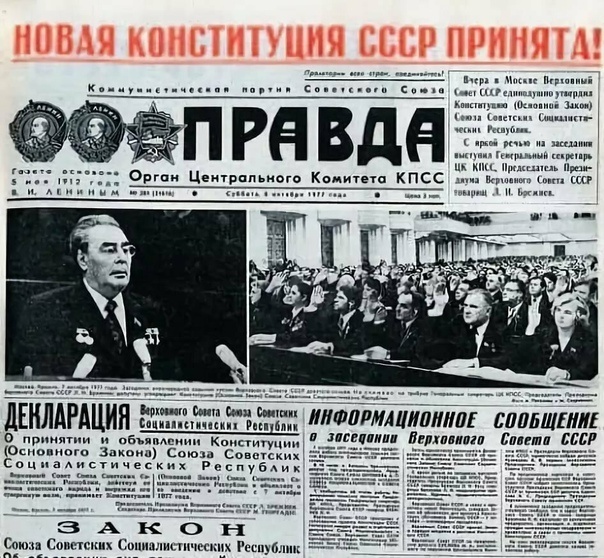 Напомню, что именно 7 октября 1977 г. Верховным Советом СССР была принята новая Конституция, которую ещё иногда называют «Брежневской конституцией».
