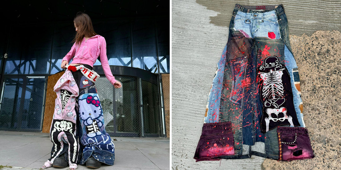 — Я всегда старался придумывать что-то новое и необычное. Тех же вещей в kidcore-стиле, похожих на мои, я больше не встречал ни у кого. Ну а идею с перевернутыми джинсами, пусть саму по себе и не новую, я просто возвел в абсолют: именно такого кроя и ремней внизу калошей я тоже раньше нигде не видел. Их я тоже, кстати, начал делать абсолютно случайно: однажды выложил такие в TikTok, просто «чистые» джинсы, без всяких детских нашивочек. Аудитории понравилось, и я такой: «Опа, значит, продолжаем».