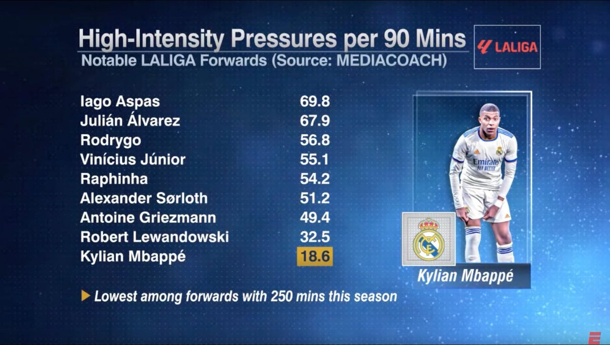 В сети появилась интересная статистика: оказывается, что Килиан Мбаппе – один из худших нападающих, когда дело касается прессинга в чемпионате Испании в этом сезоне. В противоположность звезде «Реала» Яго Аспас из «Сельты» в свои 37 лет является одним из лучших прессингующих нападающих в Ла Лиге. Одноклубники француза Винисиус и Родриго тоже отрабатывают в прессинге значительно лучше, чем Мбаппе. В свое время Килиану досталось от Луиса Энрике: перед ответным четвертьфинальным матчем между «ПСЖ» и «Барселоной» в Лиге чемпионов тренер показывал Мбаппе видео и объяснял, как французский форвард должен защищаться. «Я читал, что тебе нравится Майкл Джордан. Майкл Джордан хватал всех своих товарищей по команде за яйца и защищался как сукин сын. Ты должен подавать пример как человек и как игрок. Ты будешь играть против Кубарси, ты должен играть по нему и Тер Стегену. Ты должен всю игру прессинговать Кубарси, чтобы он не ходил вперед, а Тер Стегена – чтобы он не играл быстро. А потом ты должен