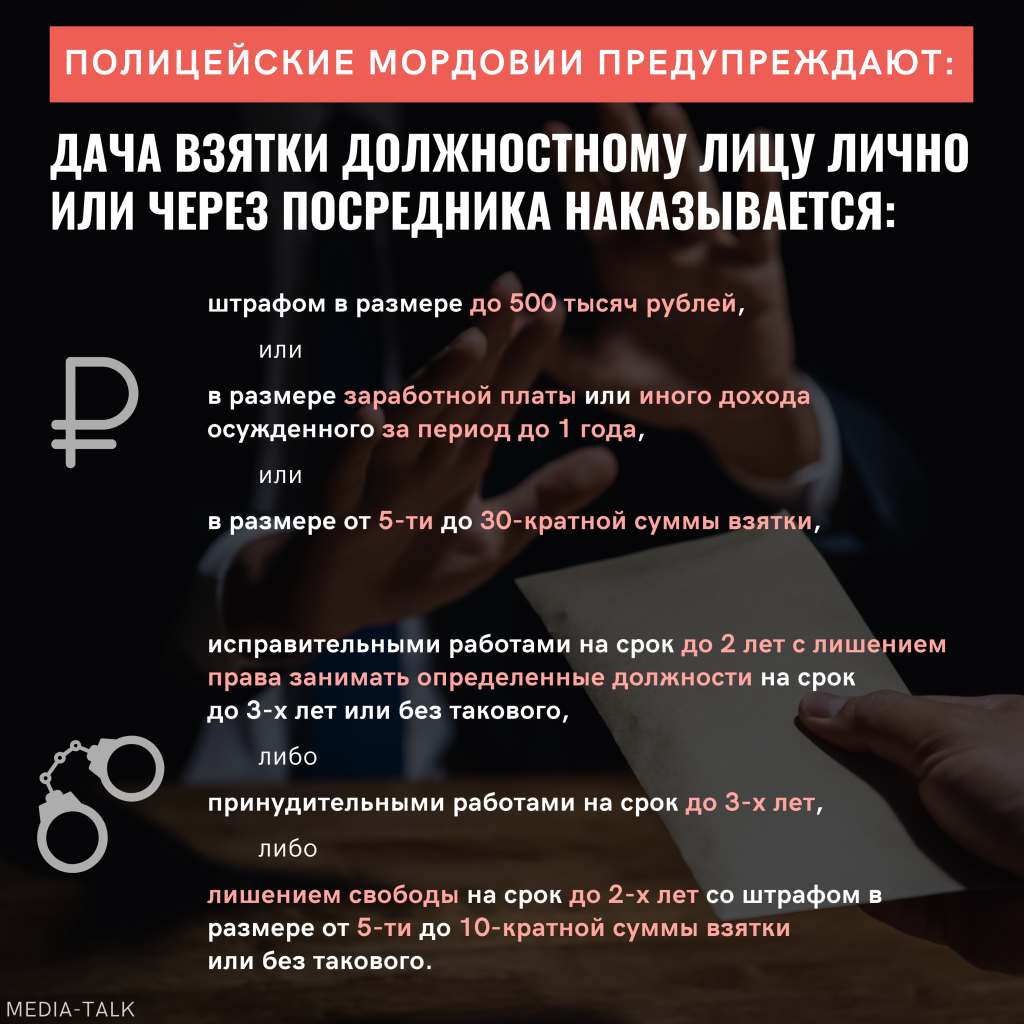 Министерство внутренних дел по Республике Мордовия напоминает, что согласно статье 291 Уголовного кодекса Российской Федерации, за дачу взятки должностно